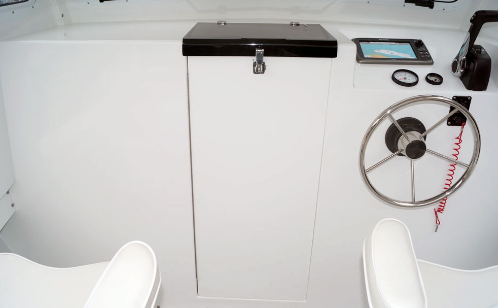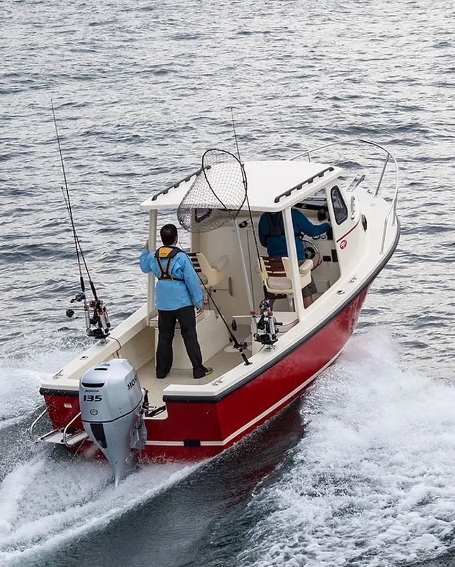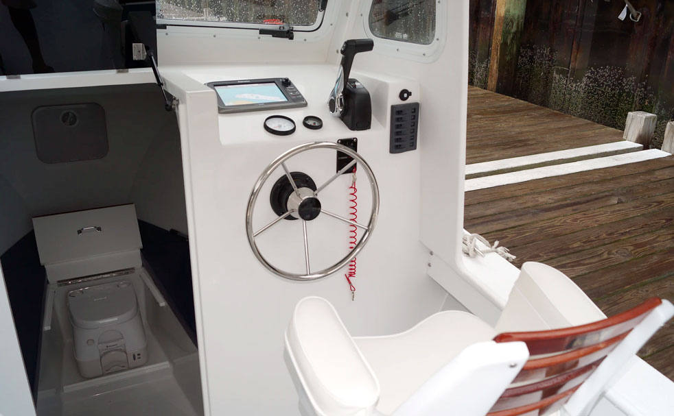 In continuous production for more than thirty years, the Sisu 22 is a classic overachiever. Choose a traditional framed “bassboat” windshield with Bimini top at the helm or an open-sided hardtop pilothouse. On deck, the only fixtures are helm and companion pedestal seats mounted on storage boxes that double as aft-facing lower seats. The rest of the cockpit can accommodate a full-transom fishbox with a cushioned seat on top, a couple of folding chairs, or a portable livewell. The open pilothouse offers shelter from sun and weather, with optional roll-down sides and mounting space for “rocket launcher” rod holders. The cabin offers 6-foot-9-inch V-berths with a portable toilet (pumpout available) and 5-feet-9-inches of headroom. Performance is strong with a 115-hp four-stroke outboard.