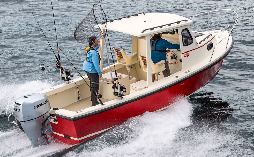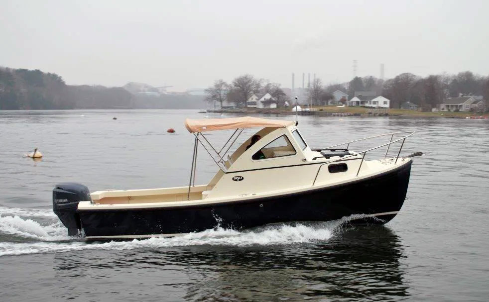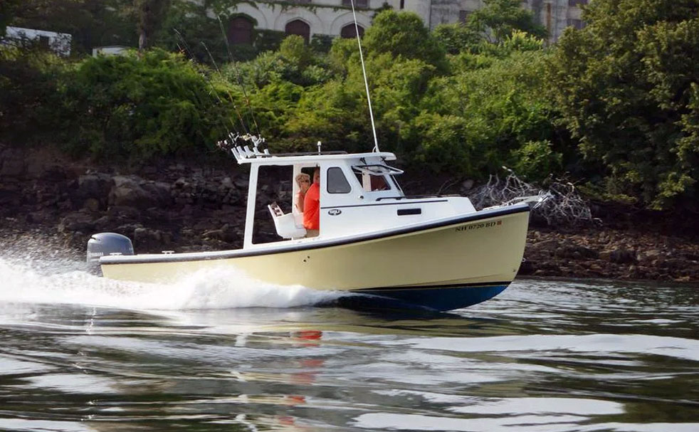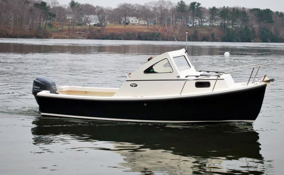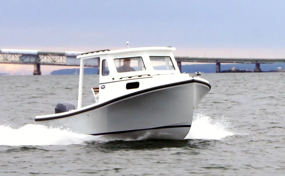 The 22 Sisu is legendary among Downeast hulls. Sisu is a Finnish word that means stamina, fortitude, and “guts”. This little beauty is aptly named. Originally drawn by Royal Lowell in the 1970s, her basic design is arguably the most seaworthy ever for a small powerboat. Modern composite materials plus a couple of design tweaks have made her even better. Recessed chines damp spray and add dynamic lift to her round chines as she accelerates, while an outboard bracket bolted to her transom frees up an outrageous amount of space in her cockpit.