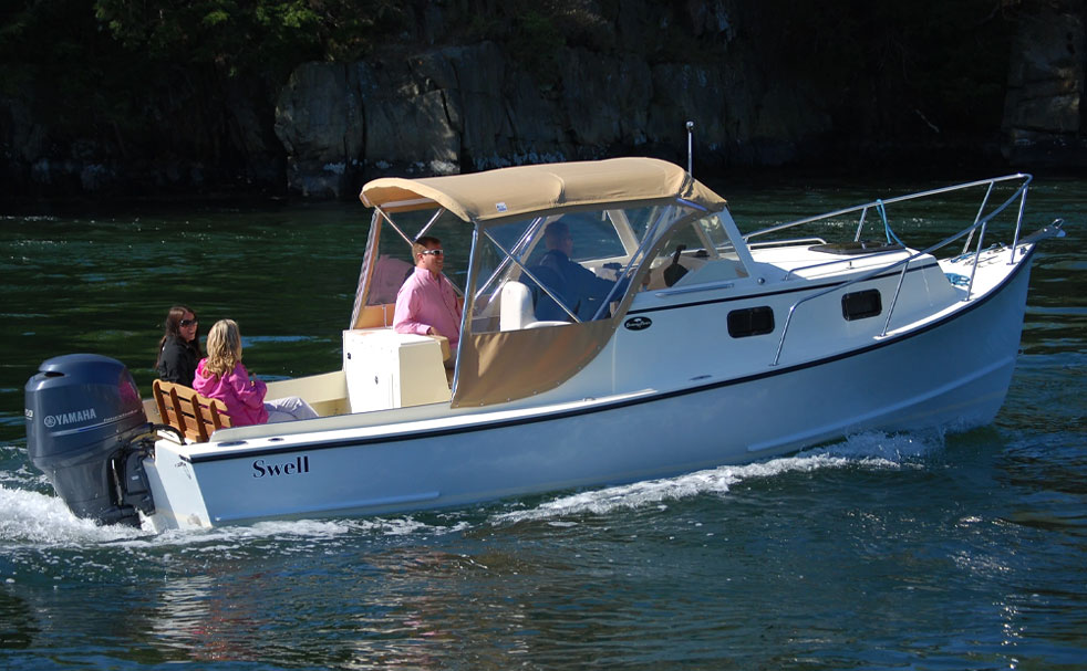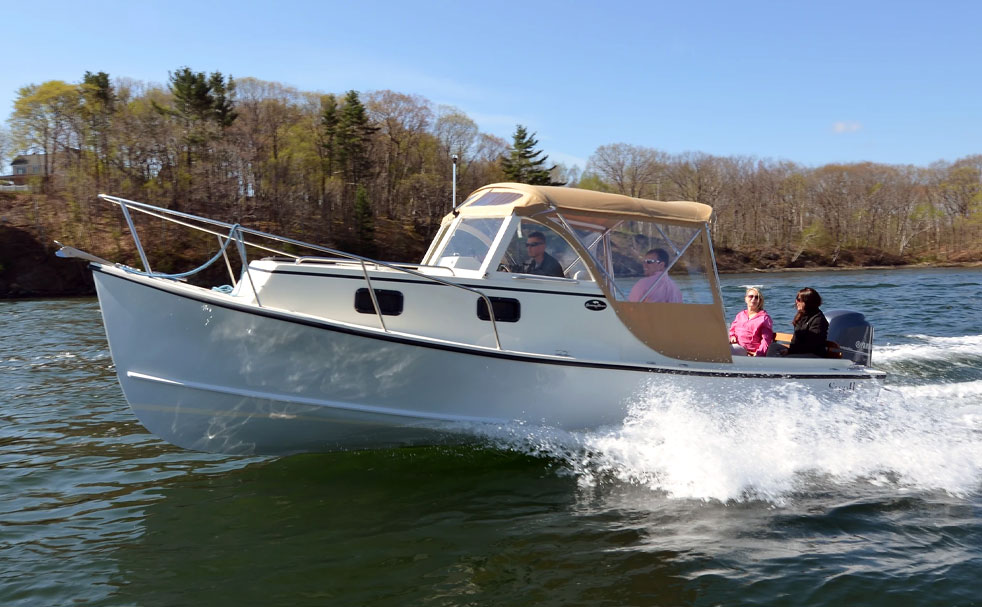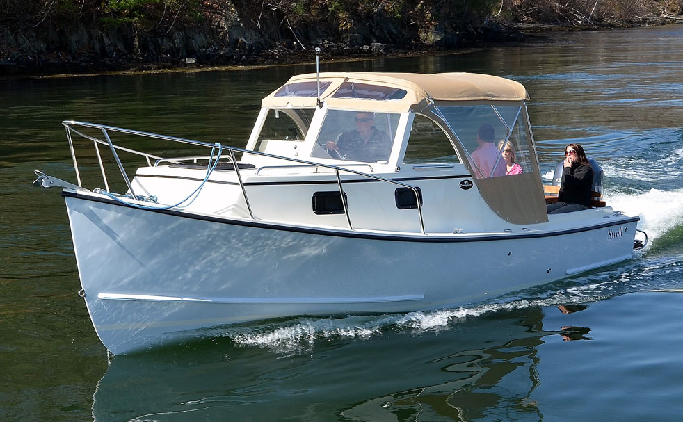 Seaway’s 24 Seafarer follows the traditional look of the New England “bass boat” with a cuddy cabin, large protective windshield and a canvas “Navy top” all built on a seaworthy, efficient workboat hull with a proud bow, low sides aft and a self-bailing cockpit. The bass boats were originally built for guides carrying anglers to fish the legendary tide rips around Martha’s Vineyard, Nantucket, and Cuttyhunk, but people soon realized how useful their layout is for day-cruising and overnights. The 24 Seafarer performs well too, with an efficient but powerful 150-hp outboard, offering easy cruising speeds of 18-25 mph with a top speed in the low 30's.