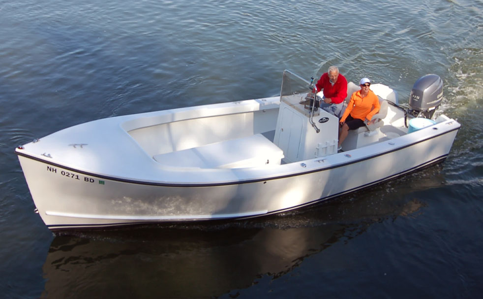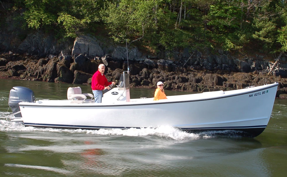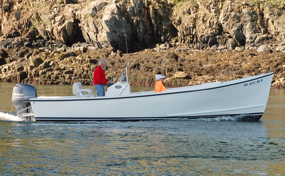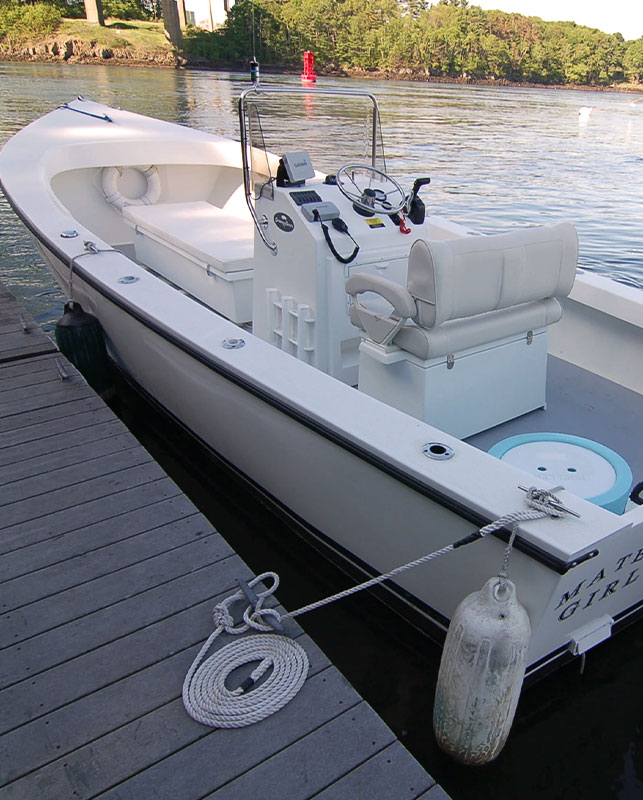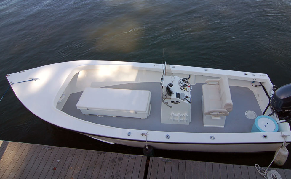 So what about use? A fishboat, a freighter to an island cottage, a great family dayboat, or even an all-weather commercial workboat for a harbormaster? The base boat includes a helm leaning post and space for a cooler beneath. The 29”-wide console has a front entry door to a head compartment with 52” of headroom, adequate even for adult males. A remote pumpout is available for the portable toilet. In front is a 60”-long storage box with a cushion, held in place with a forward turnbuckle. Need shade? Consider a folding bimini. Need radar? Add a T-top or Seaway’s custom fiberglass pilothouse. A fold-down spray dodger is available for the bow. There’s space under the port gunwales for horizontal rod racks, long enough for fly rods. The generous 23” pass-through on either side of the console allows for mounting of vertical rod racks.