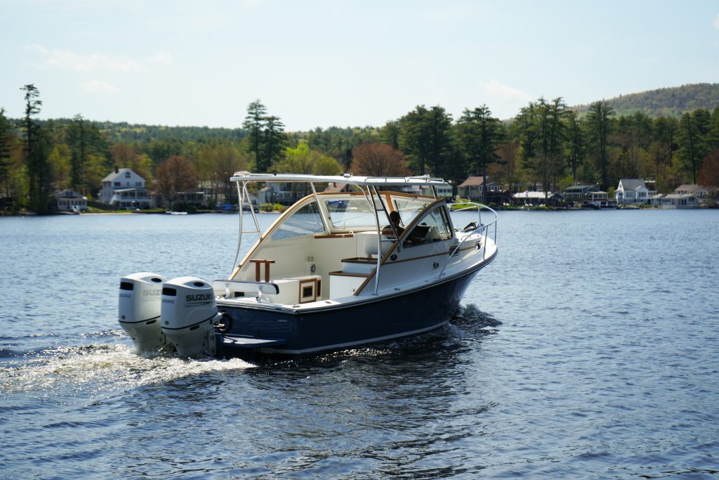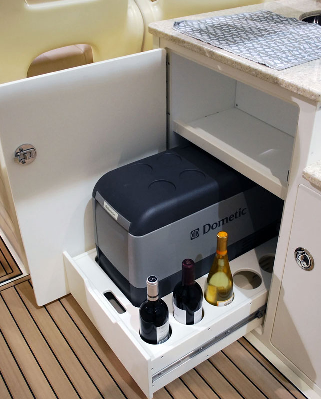 Below deck, a forward V-berth converts to a settee with table or a spacious bed. An enclosed head offers the connivence of a push button macerating marine head and a shower while a hanging locker to port side provides storage. A mid-berth under the helm deck offers additional sleeping capacity or storage. The helm deck provides a galley up aft of the double wide helm seat, with an upholstered molded bench seat to port side.